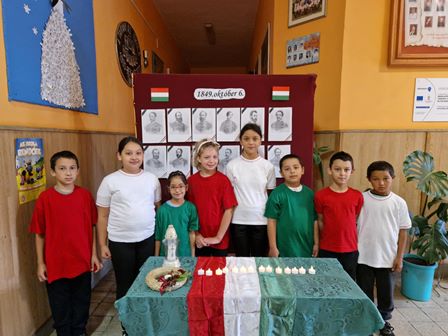 Október 6-án a 3-4. évfolyamosok verses-dalos műsorával tisztelegtünk az 1849-ben kivégzett aradi hősök emléke előtt.
